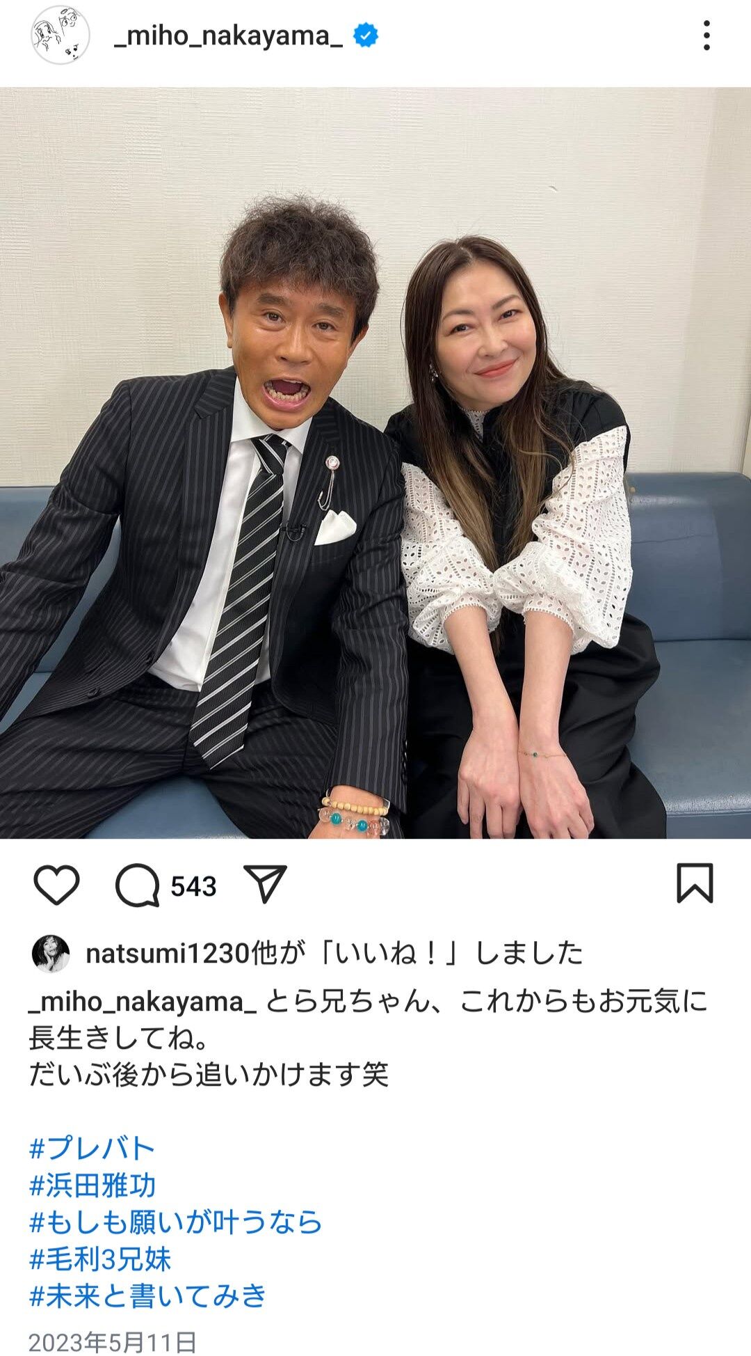 インスタでも浜田とのツ―ショットをアップ。「とら兄ちゃん、これからもお元気に長生きしてね。だいぶ後から追いかけます笑」と祝福。