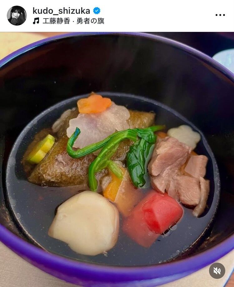 工藤はインスタグラムに「新年明けましておめでとうございます。心が温かくなるような、穏やかで優しい実りのある一年になりますように。今年もよろしくお願いします シンプルにスマートに、そして心に華を」と記し、花の形に型抜きした野菜が浮かぶ美しい雑煮や重箱につめられた豪華なお節料理、豚のかたまり肉を焼いてから煮た煮豚など、正月料理の写真をアップした。